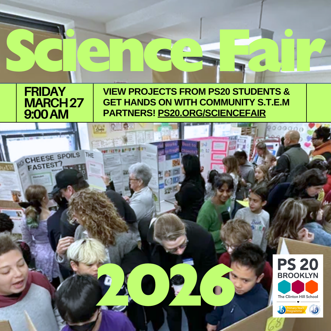 We are following all District 13 rules and guidelines for our PS20 Science Fair (note: no volcanoes, sorry!). PS20 is permitted to select 3 projects from our Science Fair to move on to the District 13 Science Fair which is scheduled to take place later in the Spring. We look forward to supporting all of our students in creating successful Science Fair projects!